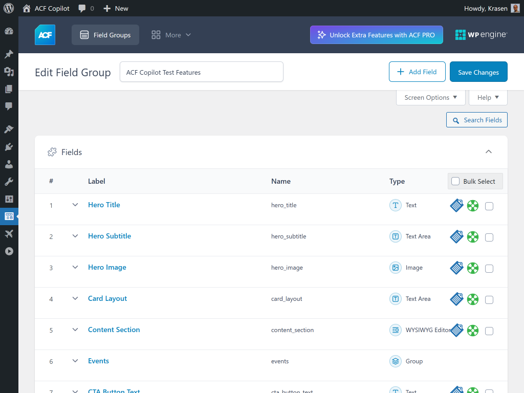 Describe your fields in plain English: "Create a team member with name, photo, bio, and social links." The AI generates a complete field group with proper field types and settings - ready to use immediately.