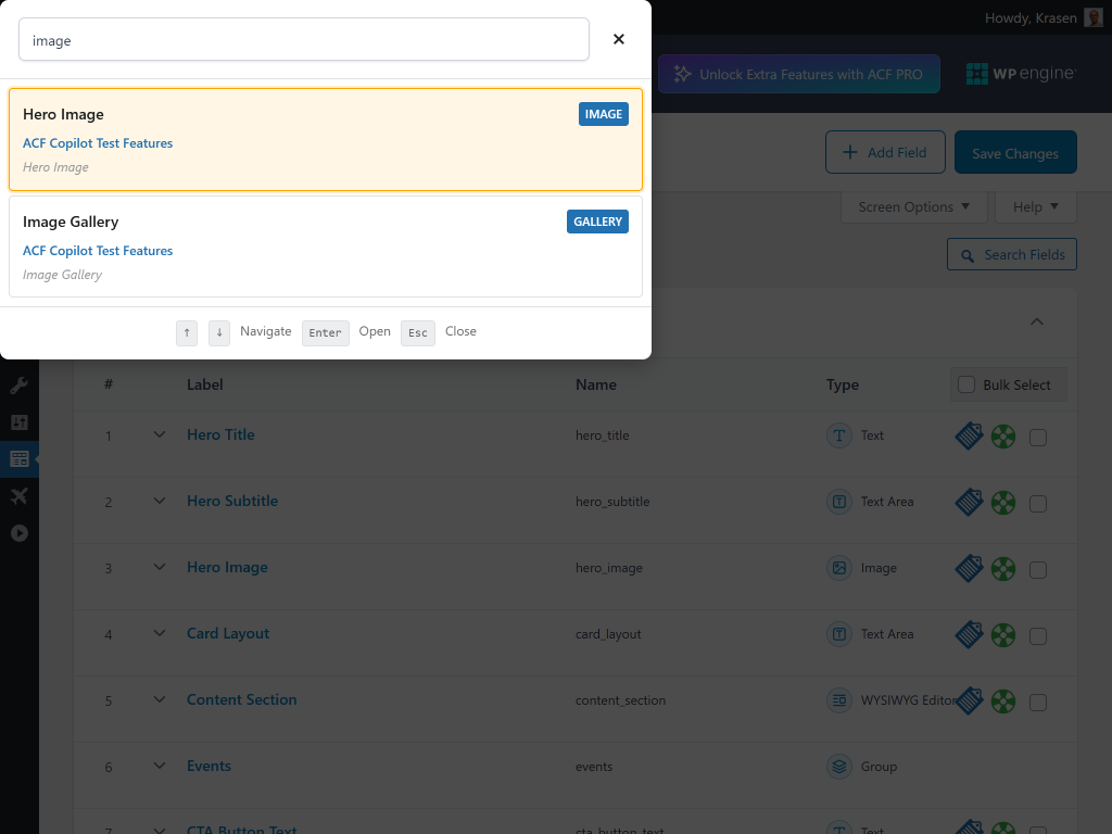 Press Ctrl/Cmd + K to instantly search across all field groups