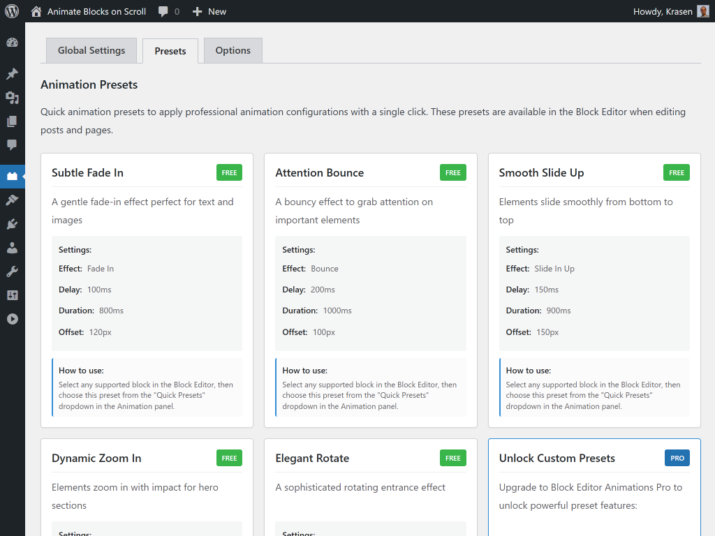 Open the Animation panel on any block, click the Quick Presets dropdown, and select a preset: Subtle Fade In, Attention Bounce, Smooth Slide Up, Dynamic Zoom In, or Elegant Rotate.