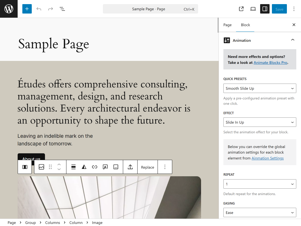 Edit any page in Block Editor, select the block you want to animate, open the Animation panel in the sidebar, choose an effect (fade, slide, zoom, etc.), and publish.