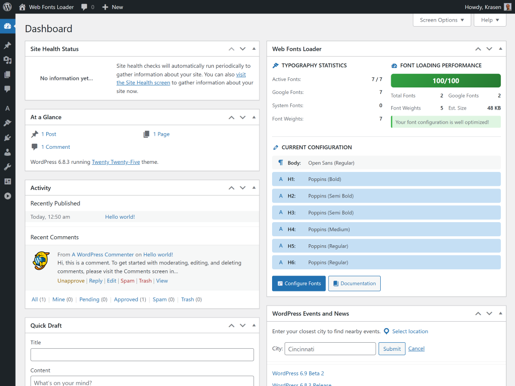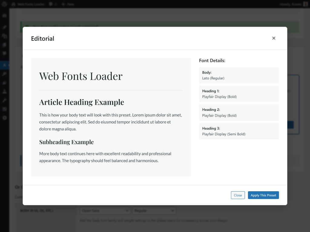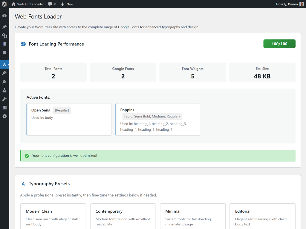 Go to the plugin settings in admin, select fonts for headings and body text, and save. Fonts load automatically on your site frontend.